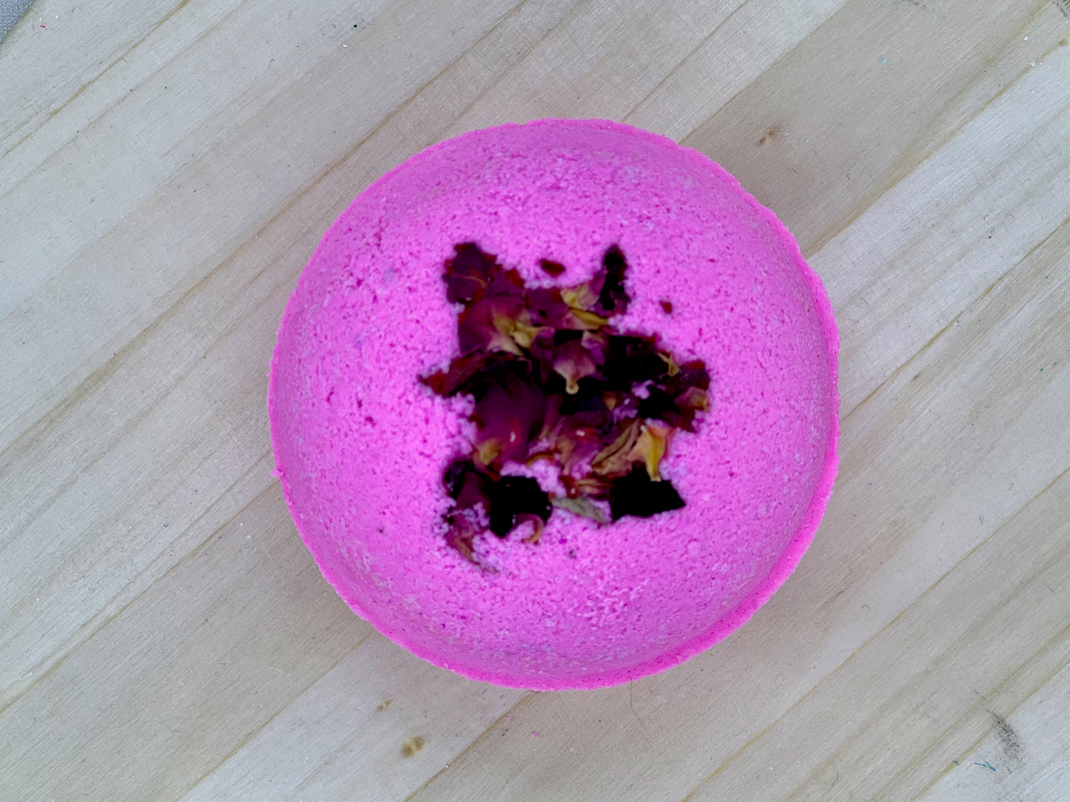 Ingredients: baking soda, citric acid, SLSA, cream of tartar, white kaolin clay, shea butter, sweet almond oil, fragrance, ylang ylang essential oil, vitamin E oil, polysobrate 80, water soluble colorant, dried rose petals, isopropyl alcohol.
