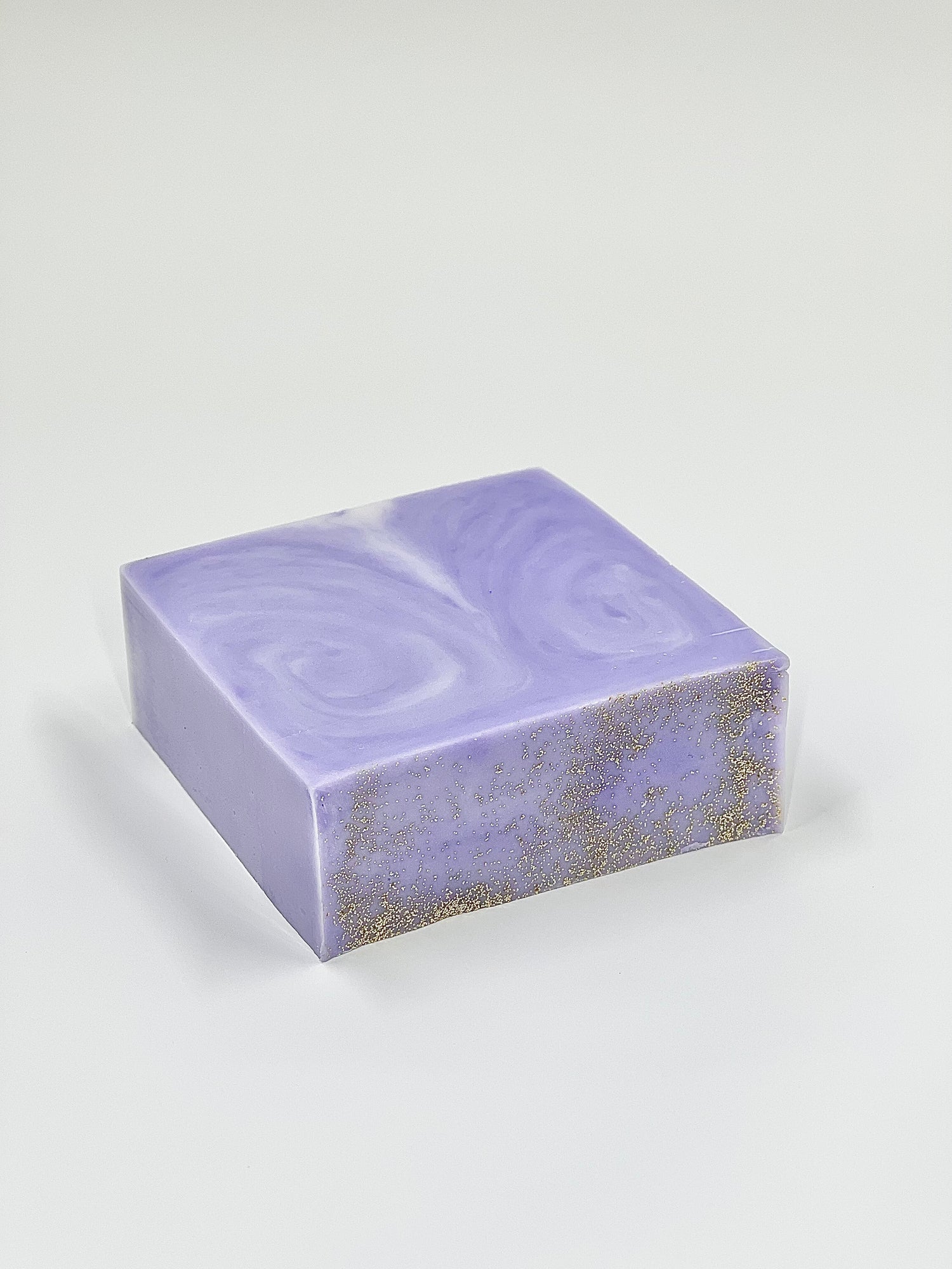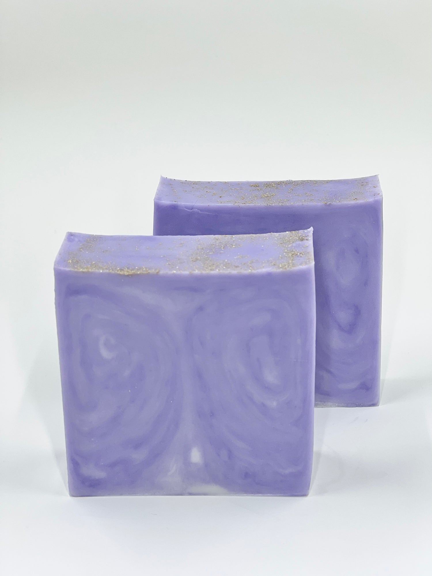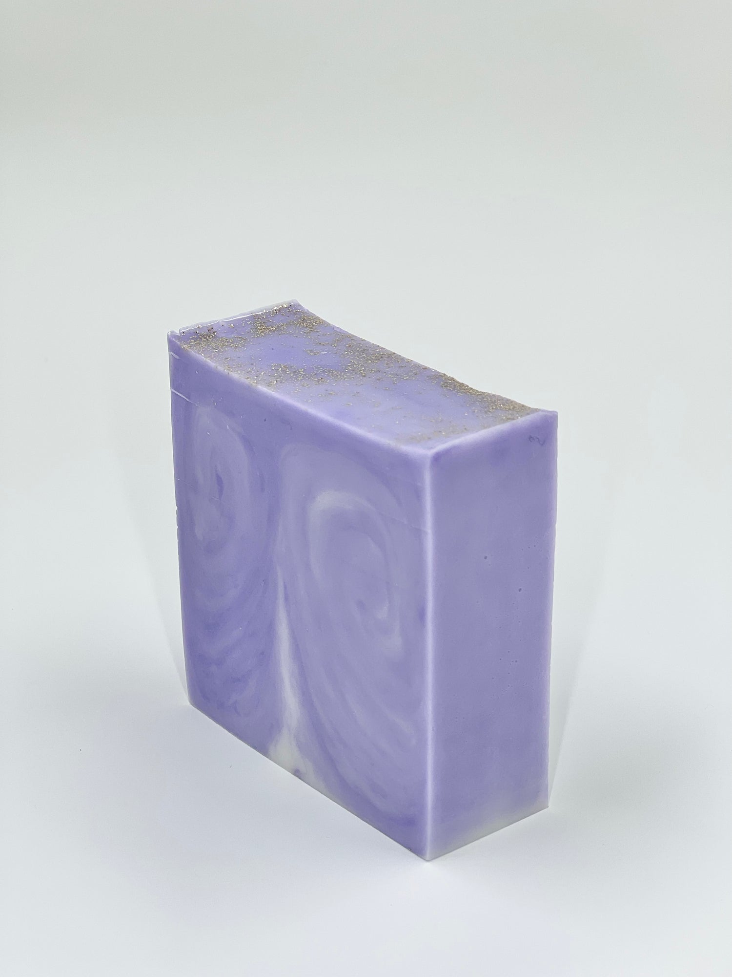 Ingredients: goat's milk soap base( coconut oil, palm oil, safflower oil, glycerin, goat's milk water, sodium hydroxide, sorbitol, propylene glycol, Sorbian prelate, oat protein, titanium dioxide) lavender essential oil , orchid color mica, light gold color mica, bio degradable gold glitter.